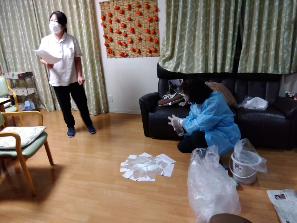 先日、デイサロンいきいきでは「ノロウィルスの吐物処理研修」を行いました。