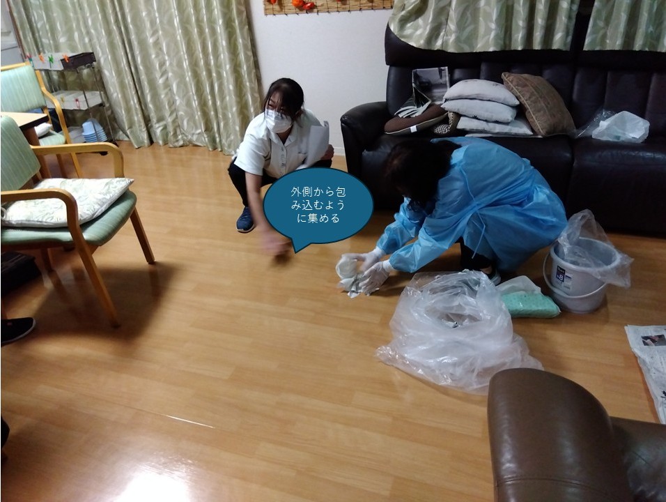 ふき取る手順やエプロン・マスク・グローブの外し方まで、実際の流れに沿って行われました。
