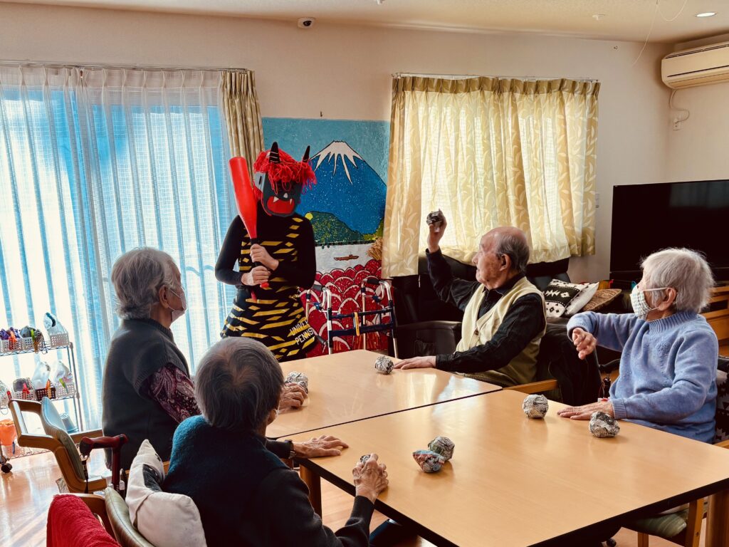 皆さんとっても楽しそうに鬼に向かって、鬼は~外!!