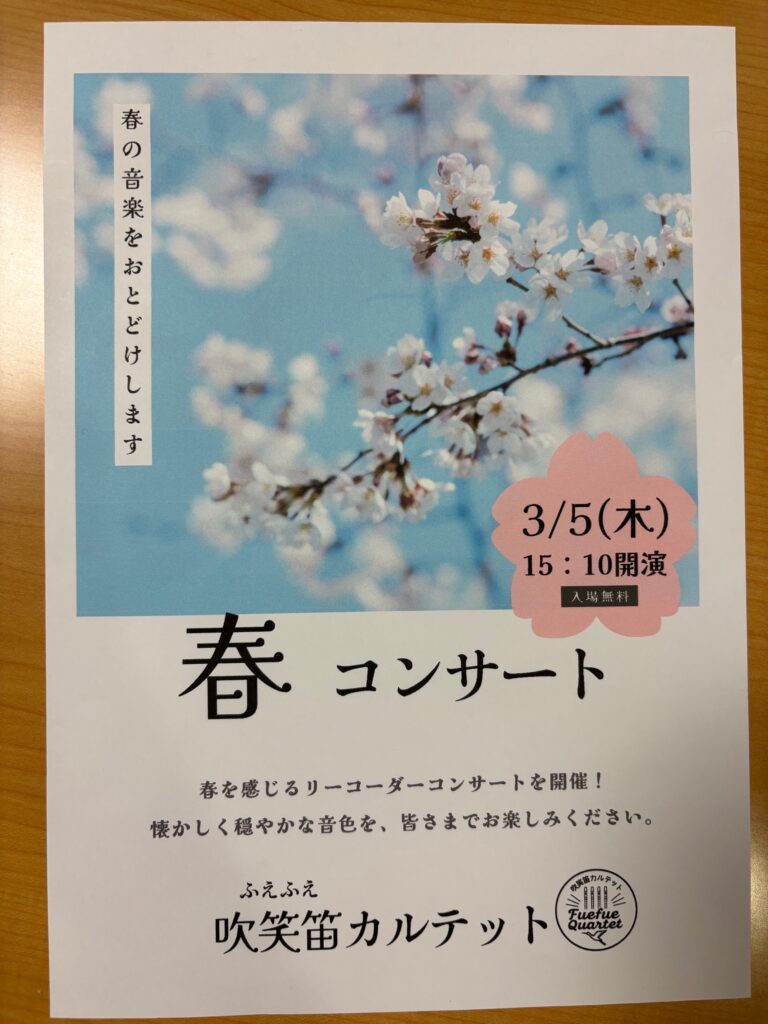 先日、吹笑笛(ふえふえ)カルテットさんによる、春のリコーダーコンサートが